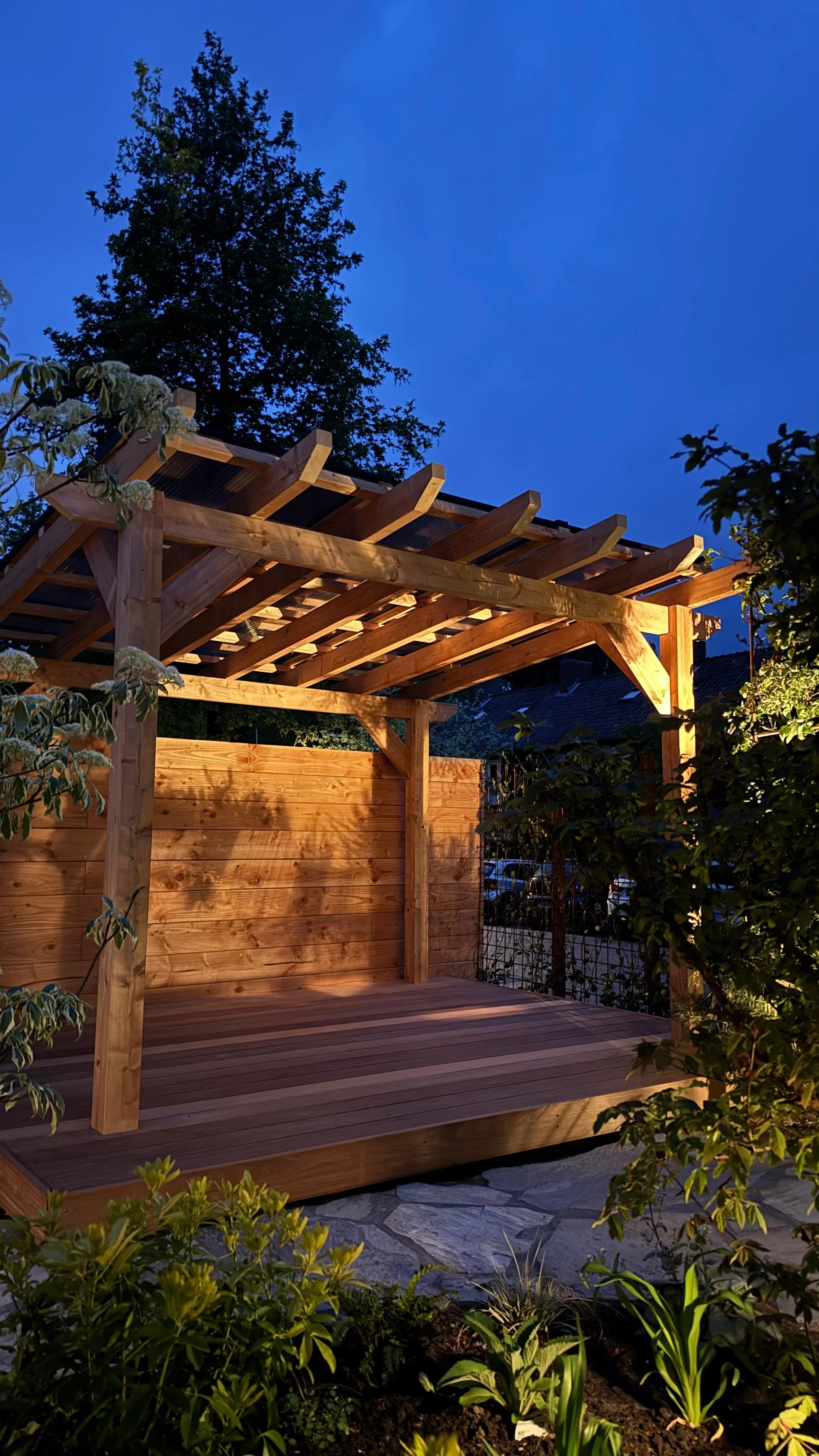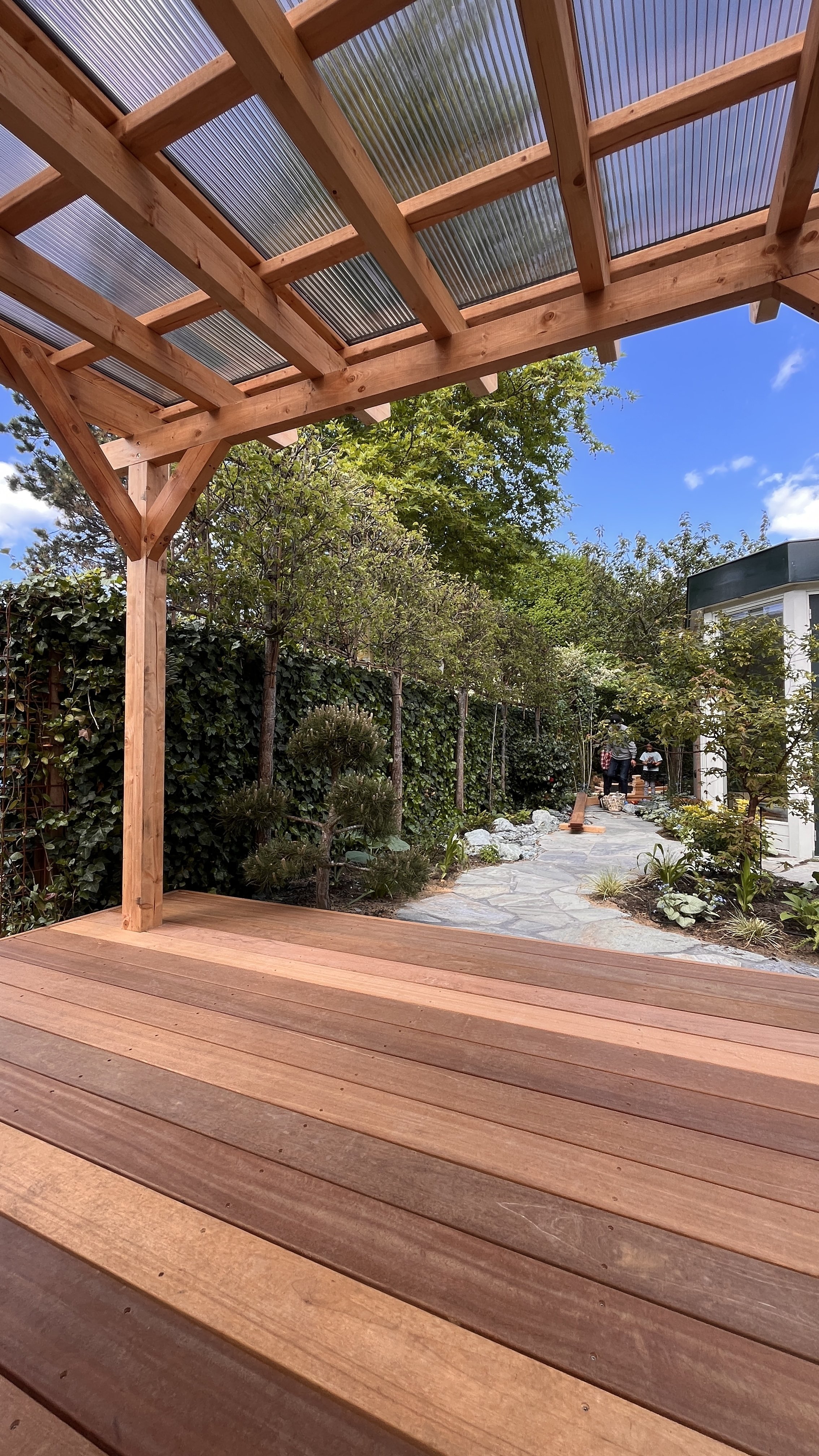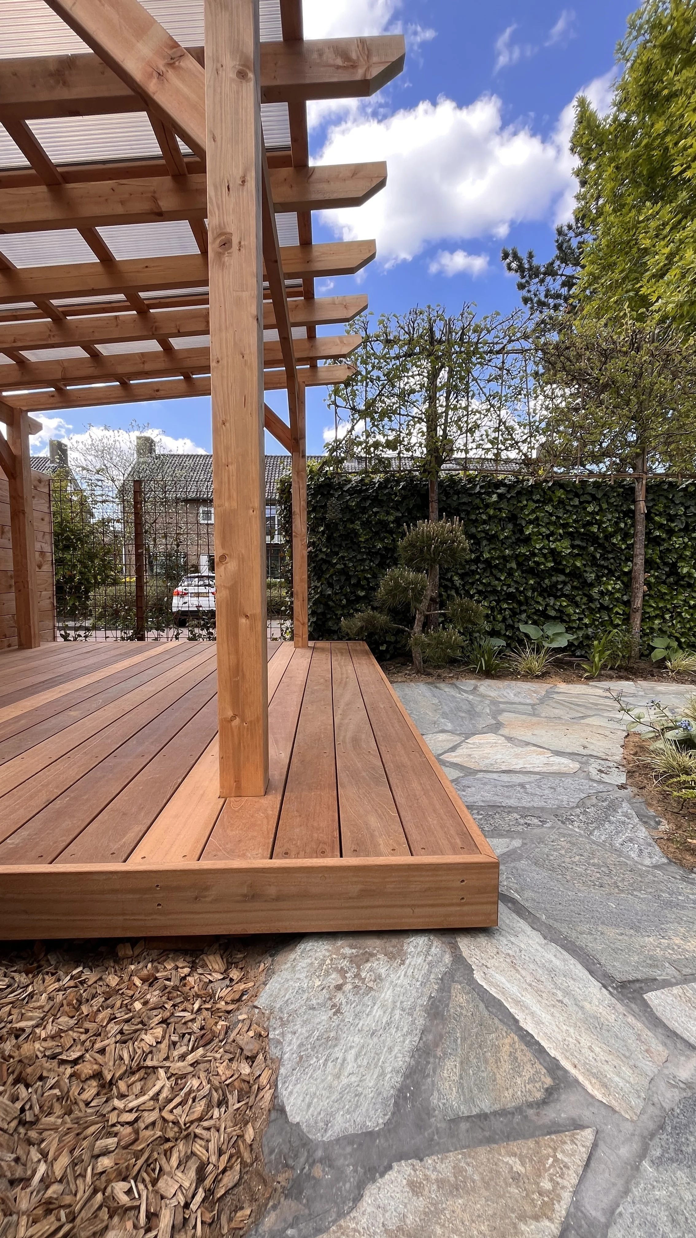 De wens van de bewoners: een overdekte plek in de tuin, passend bij hun moderne, Japanse tuindesign. Meeder Maatwerk bouwde een pergola met een dak van bronskleurig polycarbonaat, strak omlijst met zwart profielmateriaal. Het dak is gelaagd opgebouwd: stevige hoofdbalken, gezaagd in moderne Japanse stijl, met verfijnde dwarsbalken die het licht filteren. Daaronder ligt een zwevende hardhouten vlonder — strak, stevig en luchtig tegelijk.