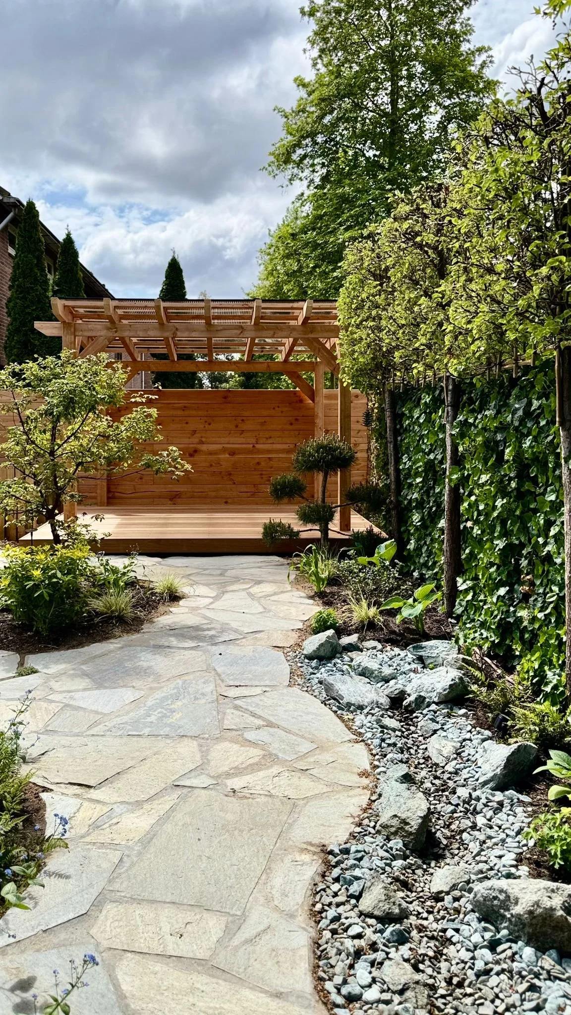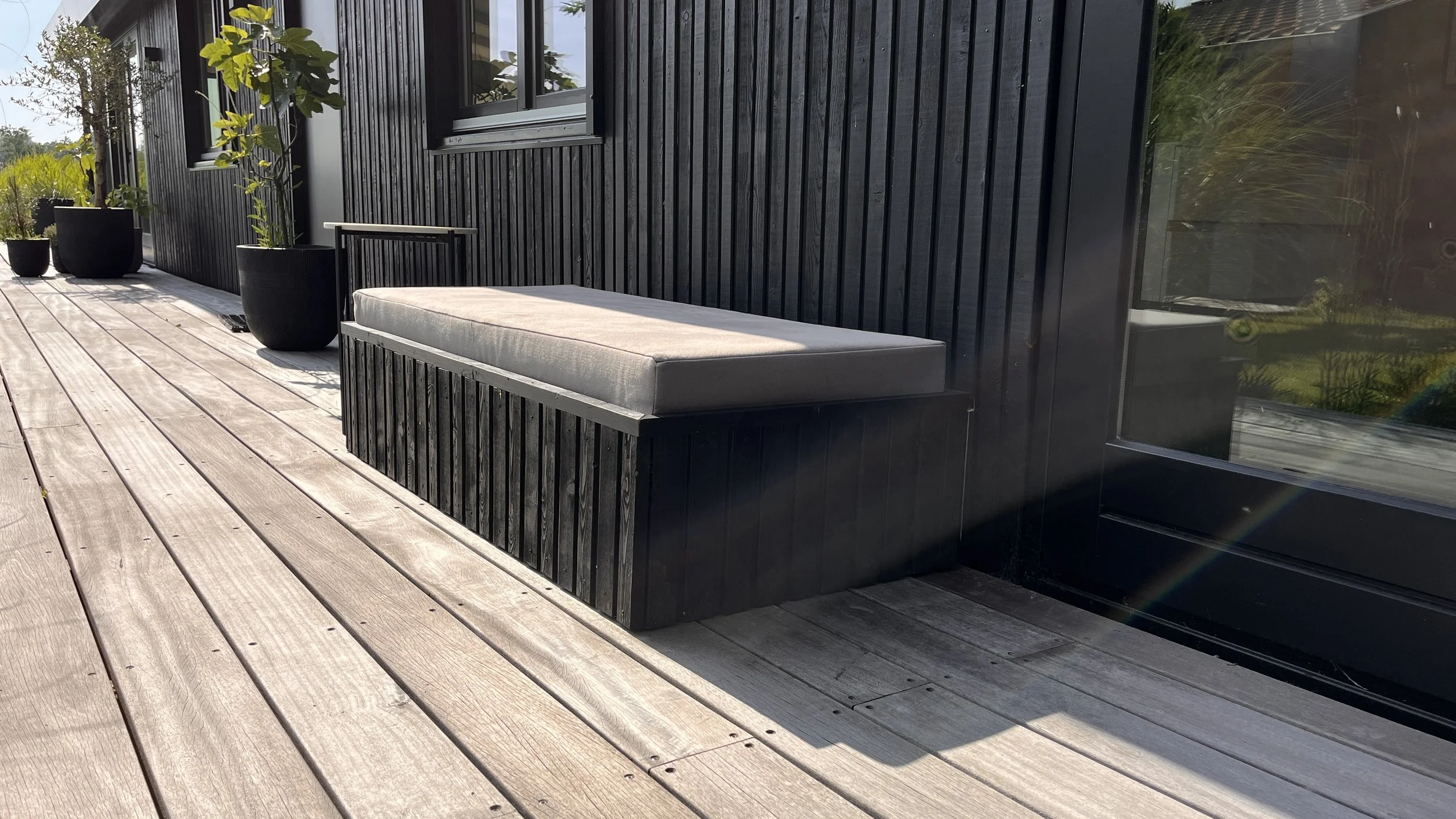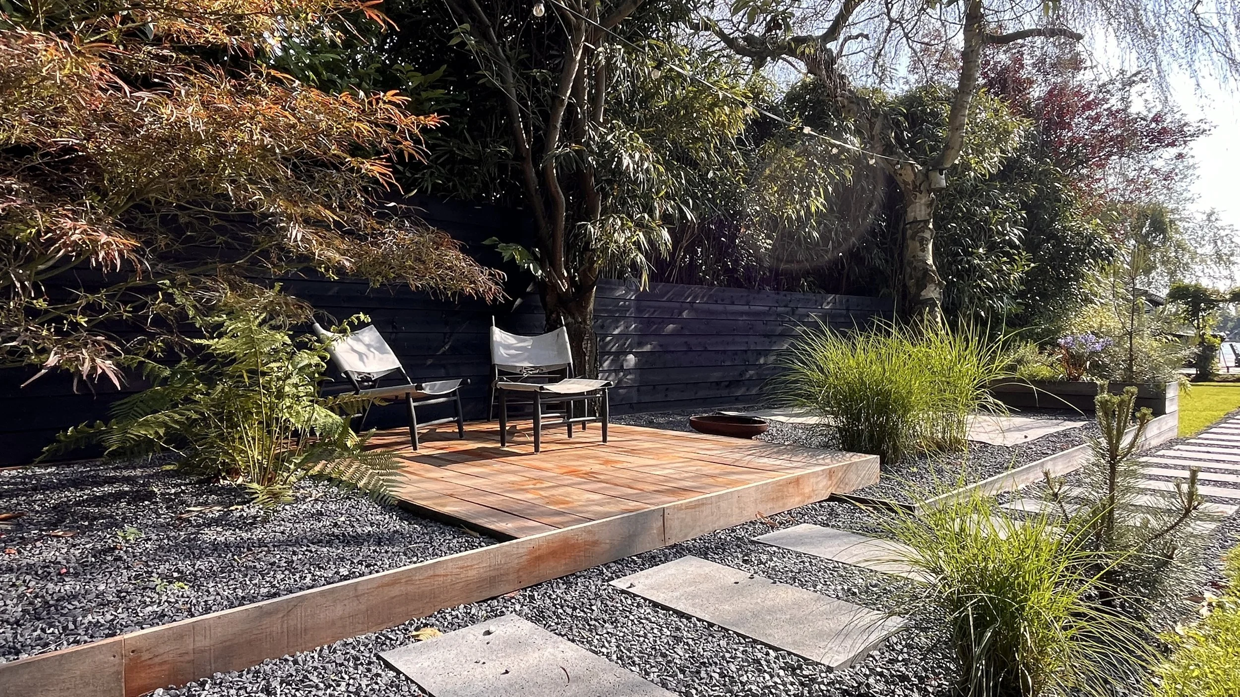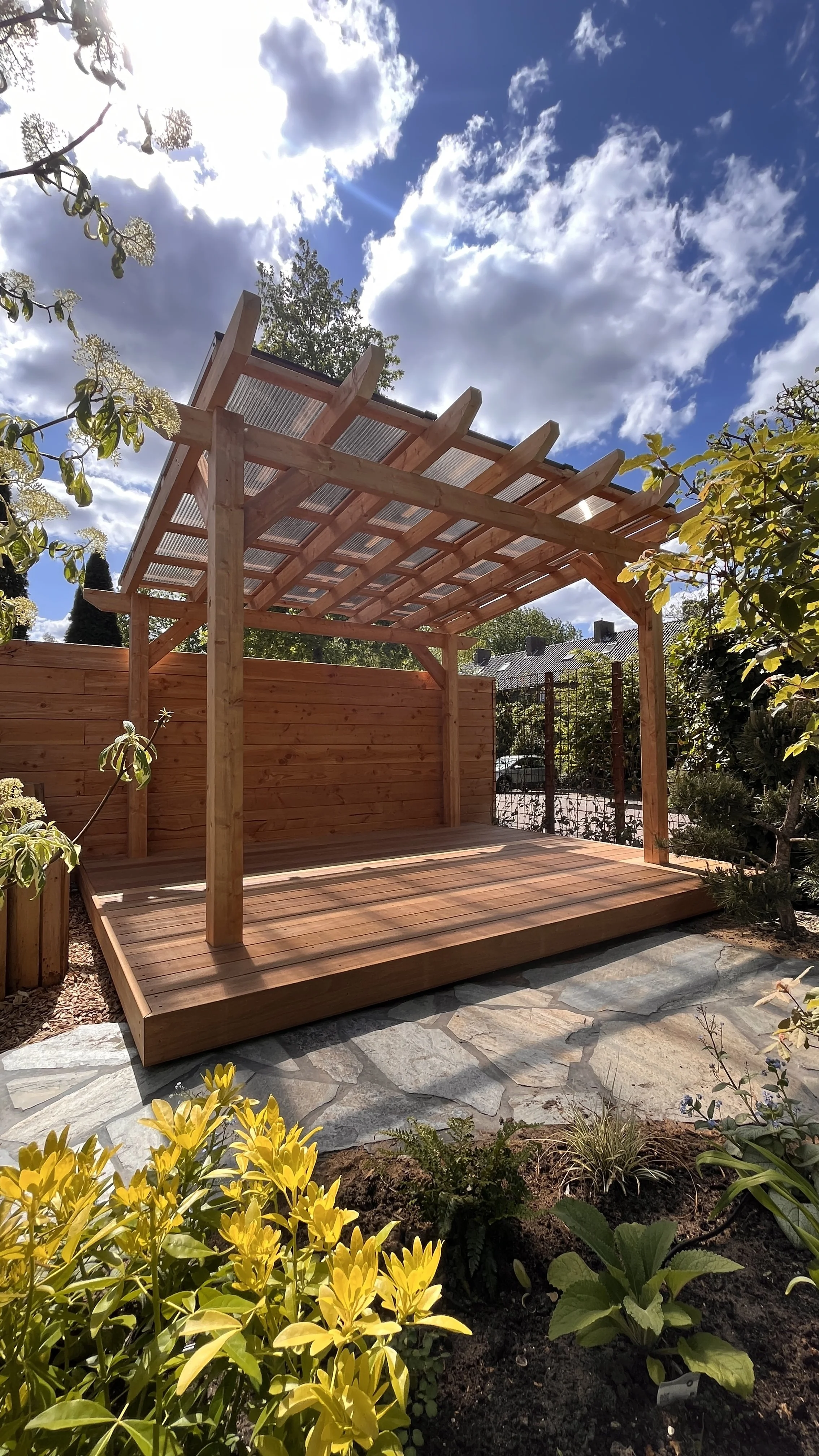 De wens van de bewoners: een overdekte plek in de tuin, passend bij hun moderne, Japanse tuindesign. Meeder Maatwerk bouwde een pergola met een dak van bronskleurig polycarbonaat, strak omlijst met zwart profielmateriaal. Het dak is gelaagd opgebouwd: stevige hoofdbalken, gezaagd in moderne Japanse stijl, met verfijnde dwarsbalken die het licht filteren. Daaronder ligt een zwevende hardhouten vlonder — strak, stevig en luchtig tegelijk.