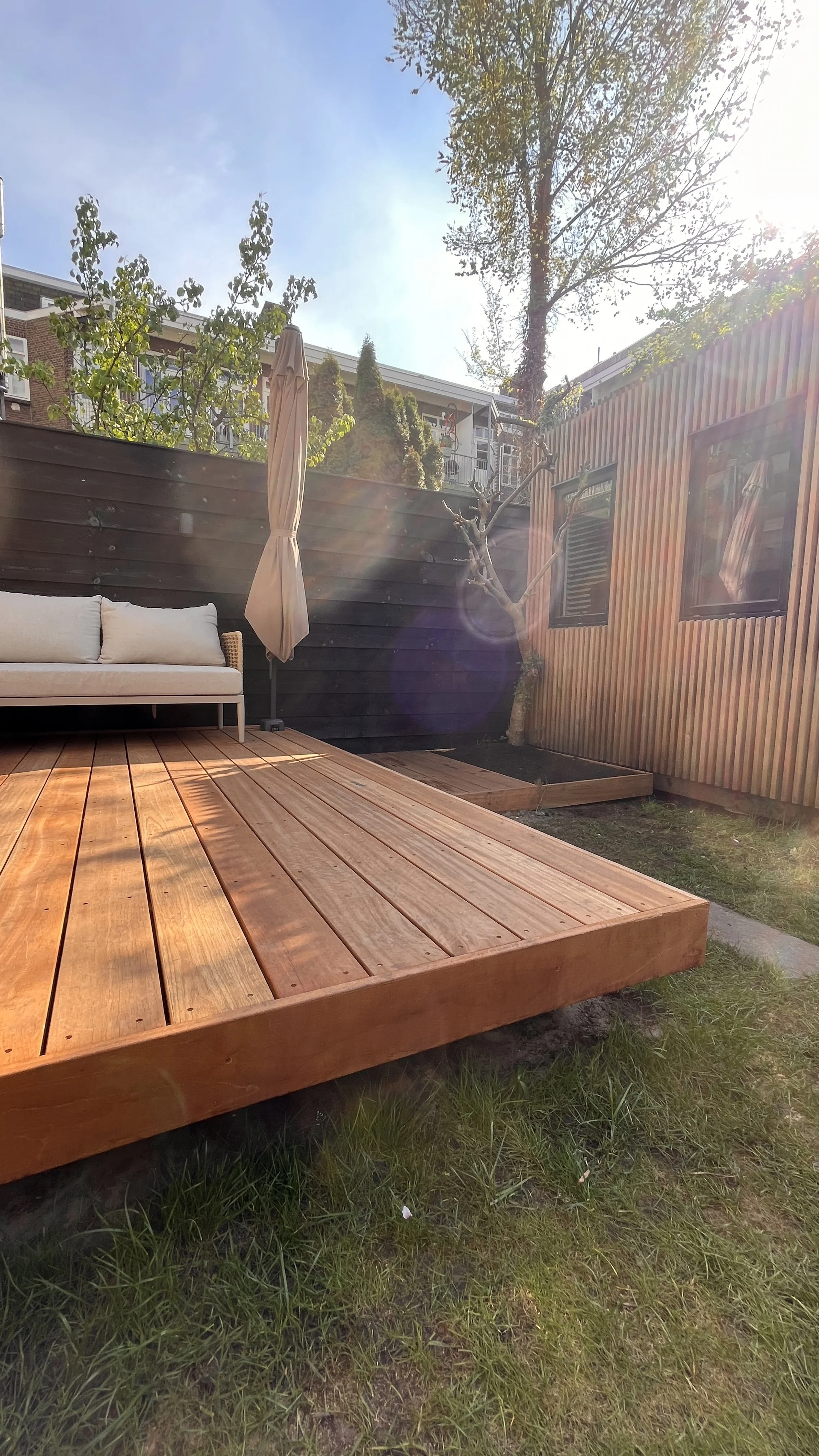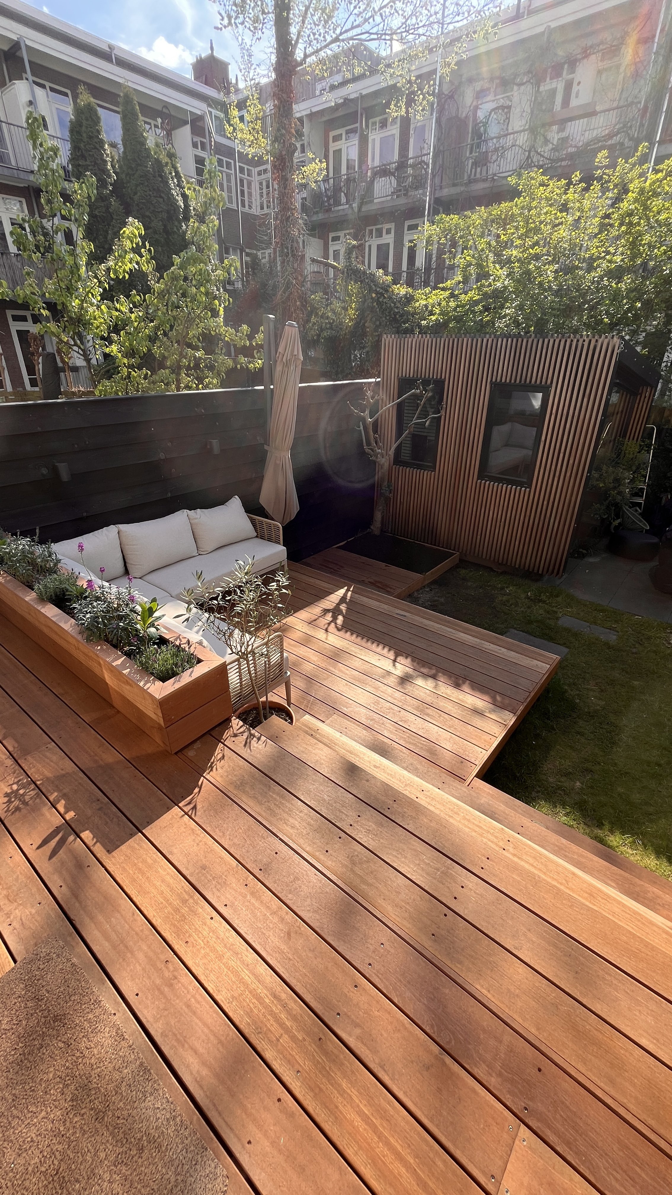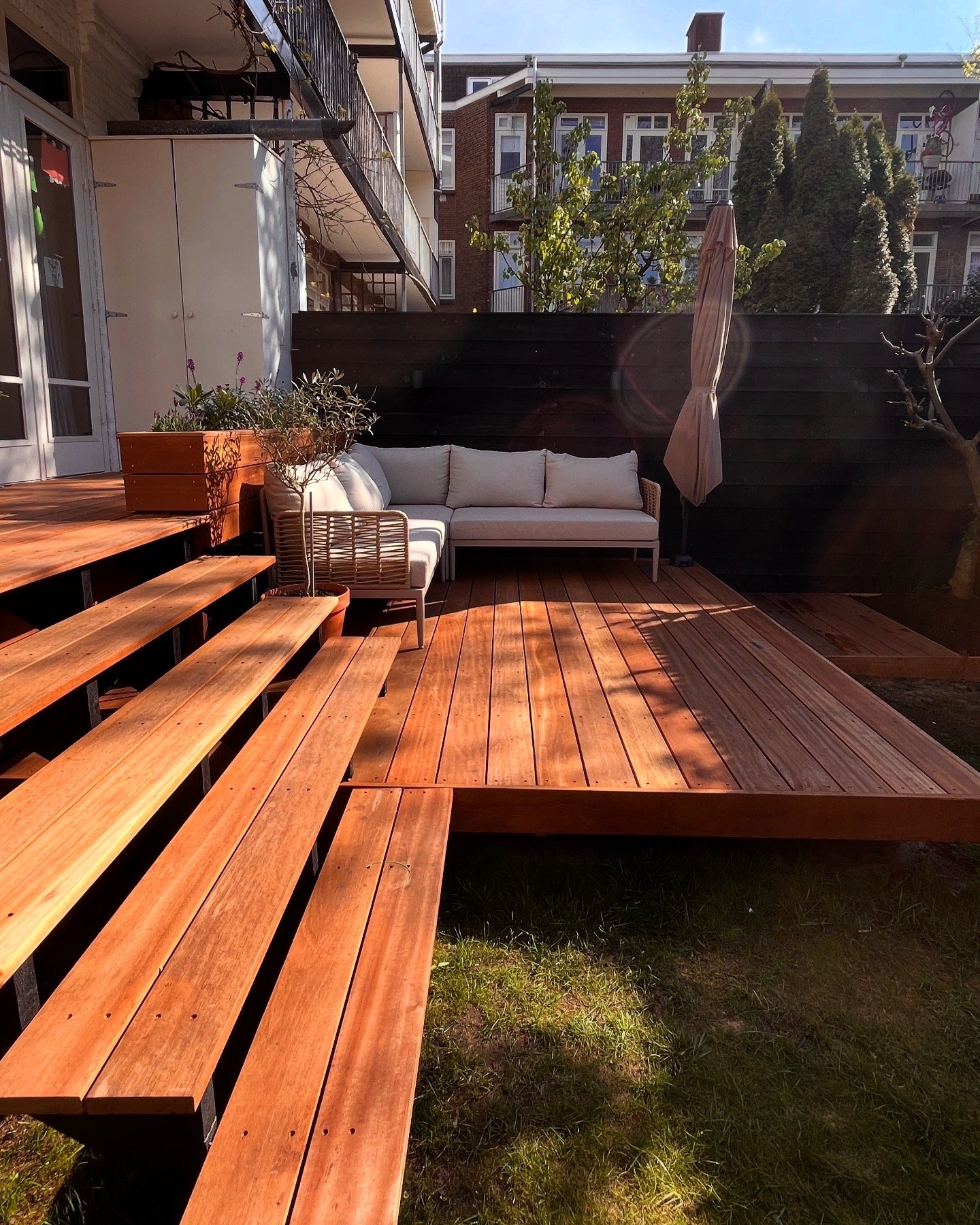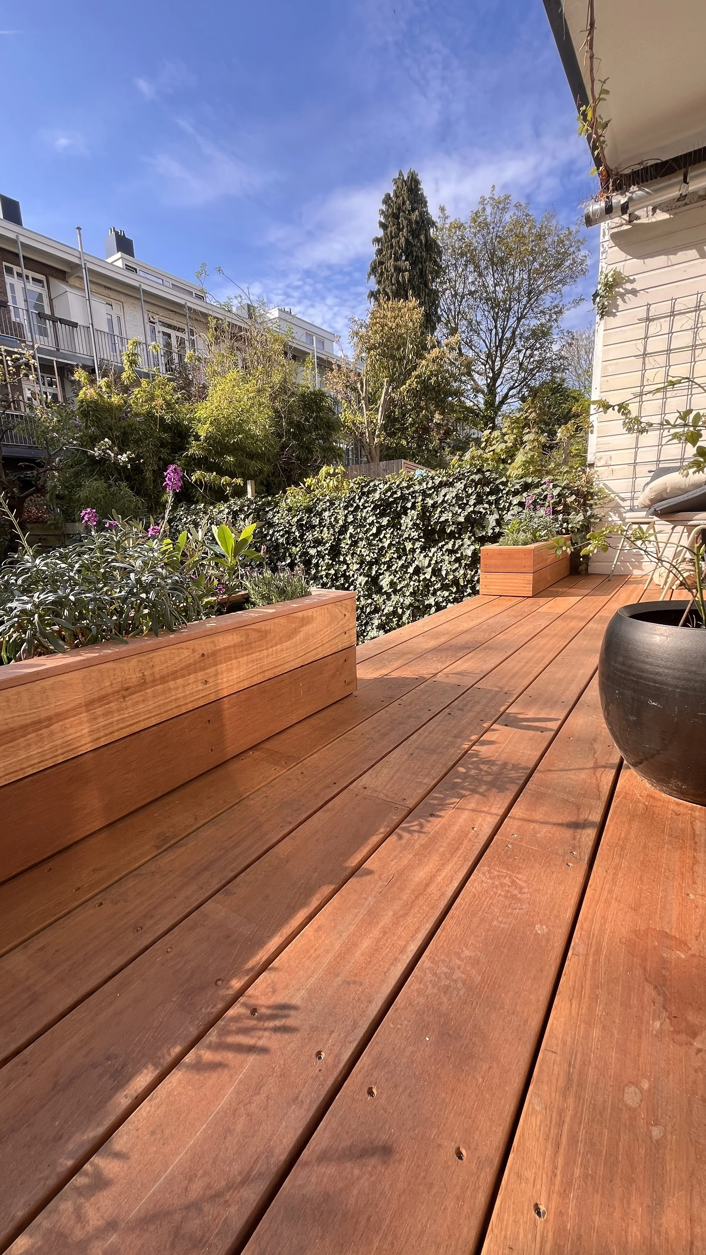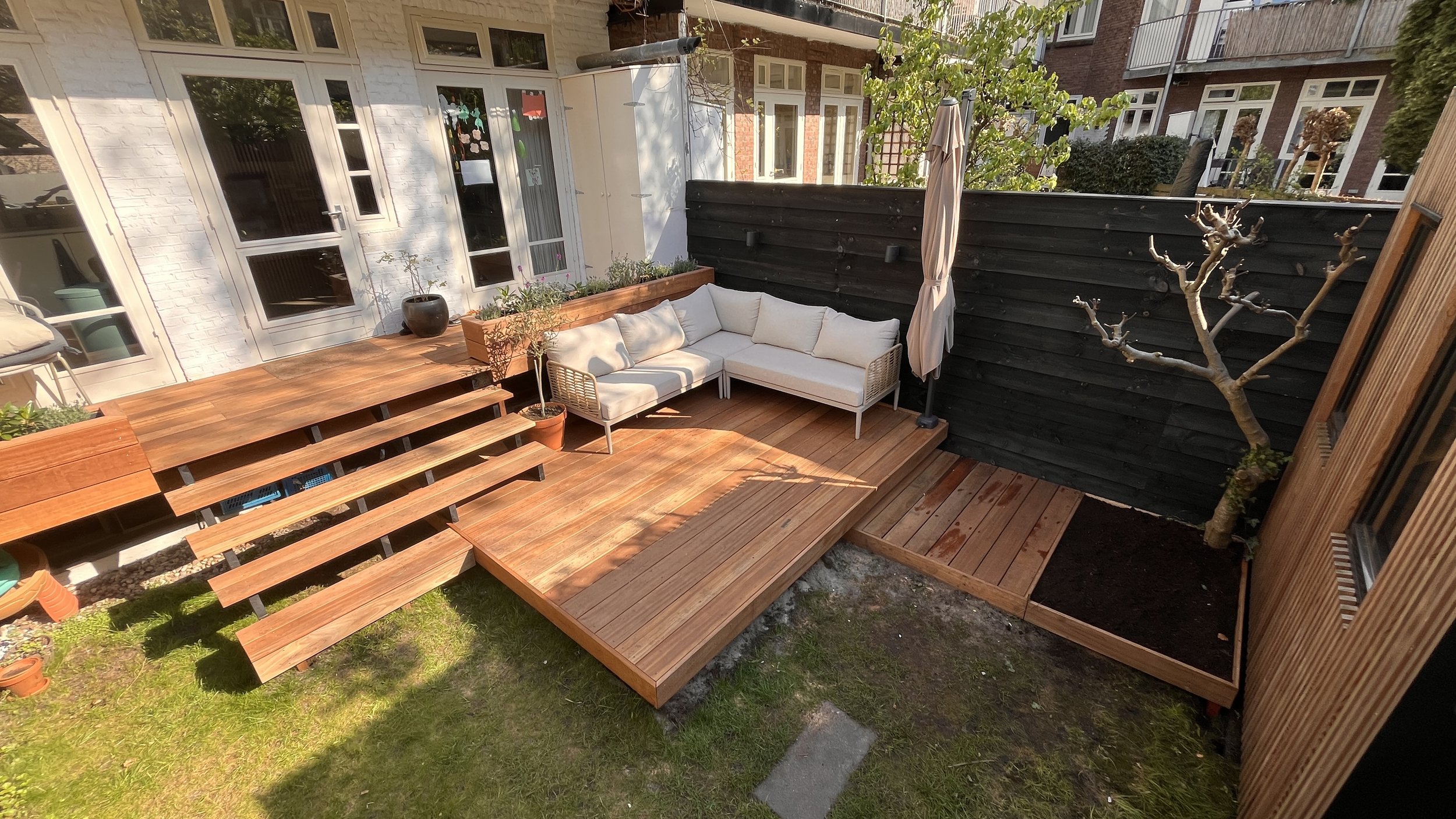 Deze stadstuin kreeg een make-over in drie lagen. De wens: meer leefruimte, sfeer en een slimme indeling. Resultaat: een hardhouten vlonderterras op drie niveaus, elk met een eigen functie. Boven het balkon, omringd door maatwerk plantenbakken voor groen en veiligheid. Een trap leidt naar het middenniveau: een 'floating deck' voor een zithoek. Het laagste niveau heeft een robuust platform voor de barbecue, met een geïntegreerde plantenbak als omlijsting.