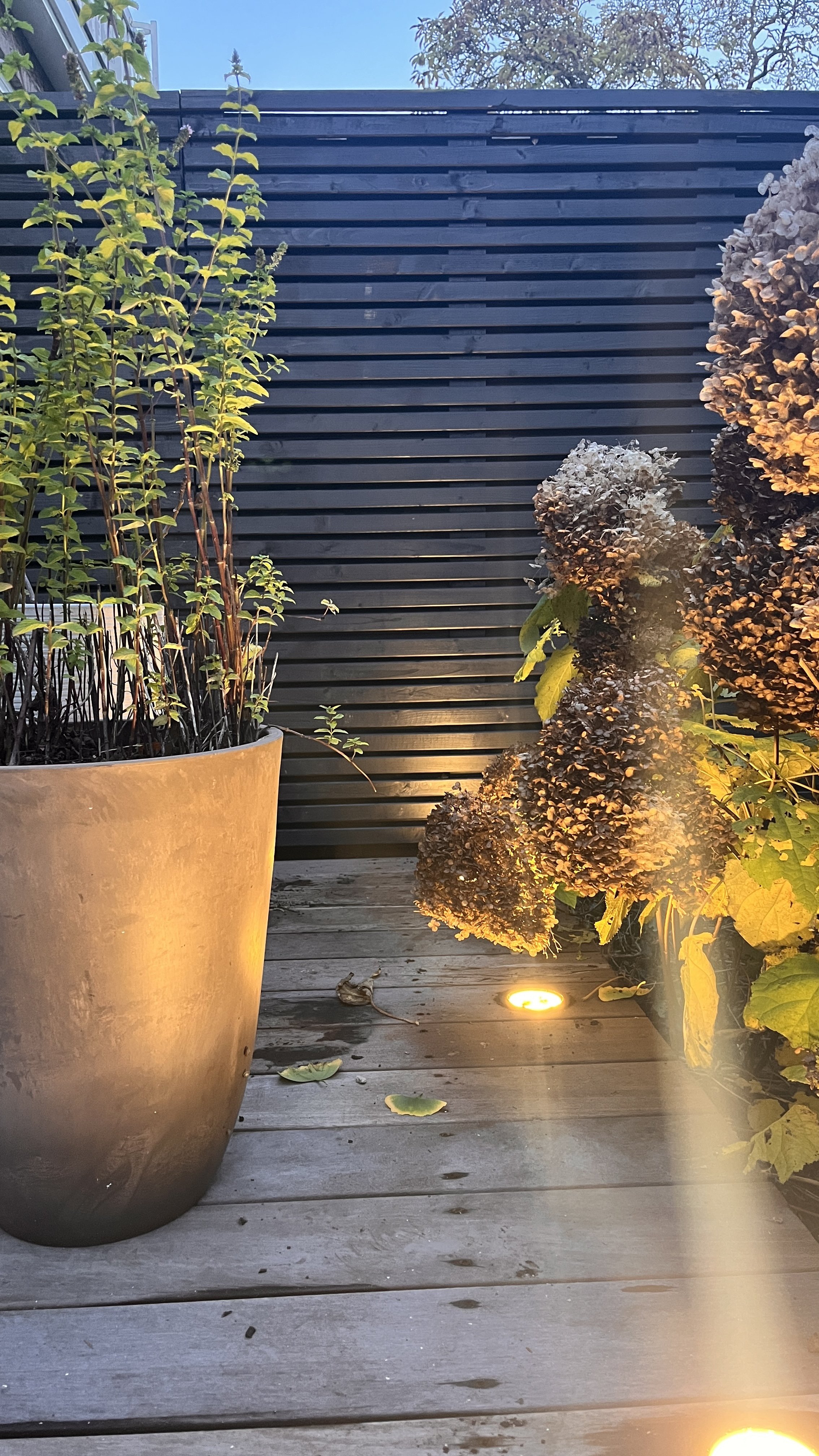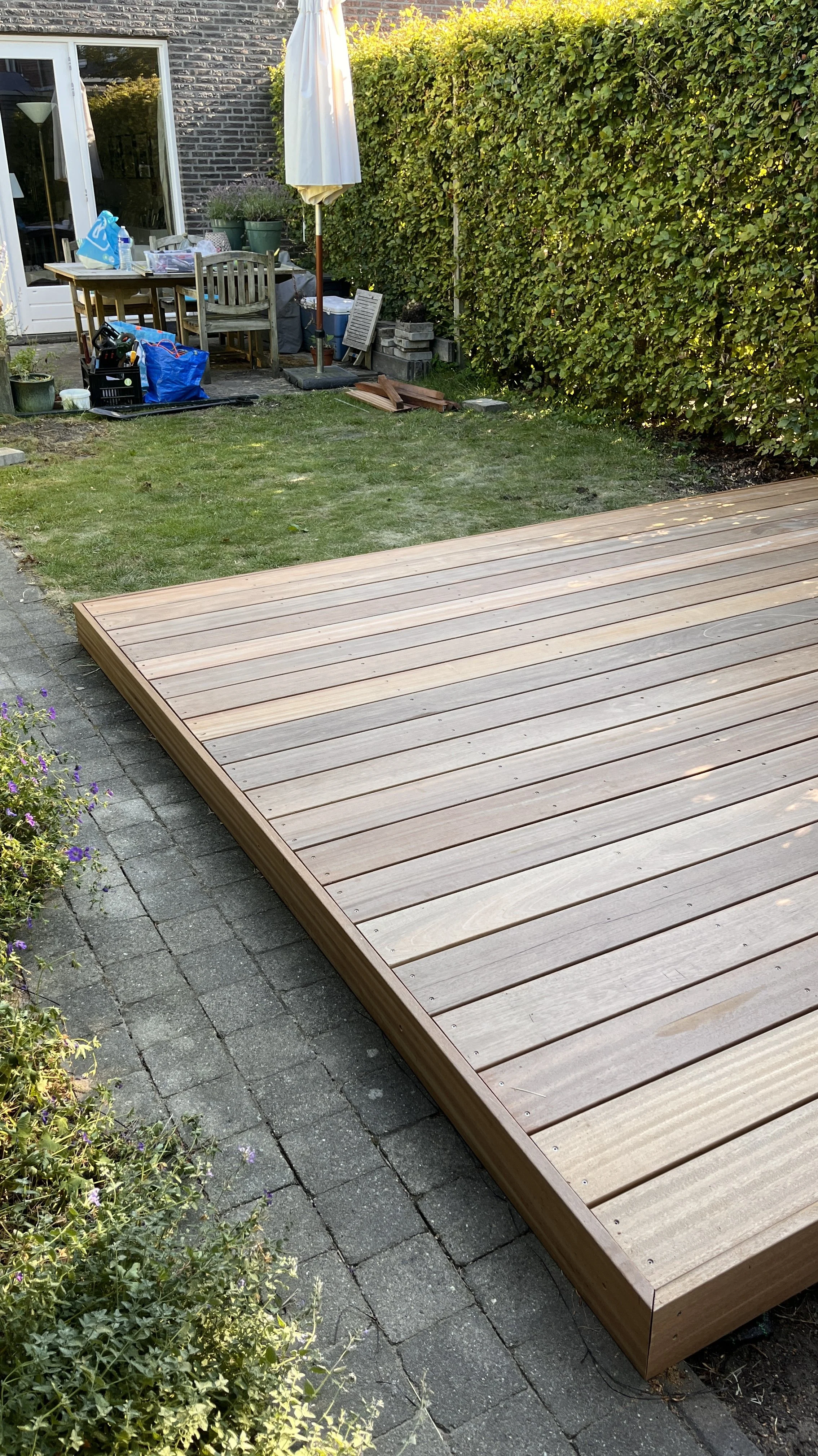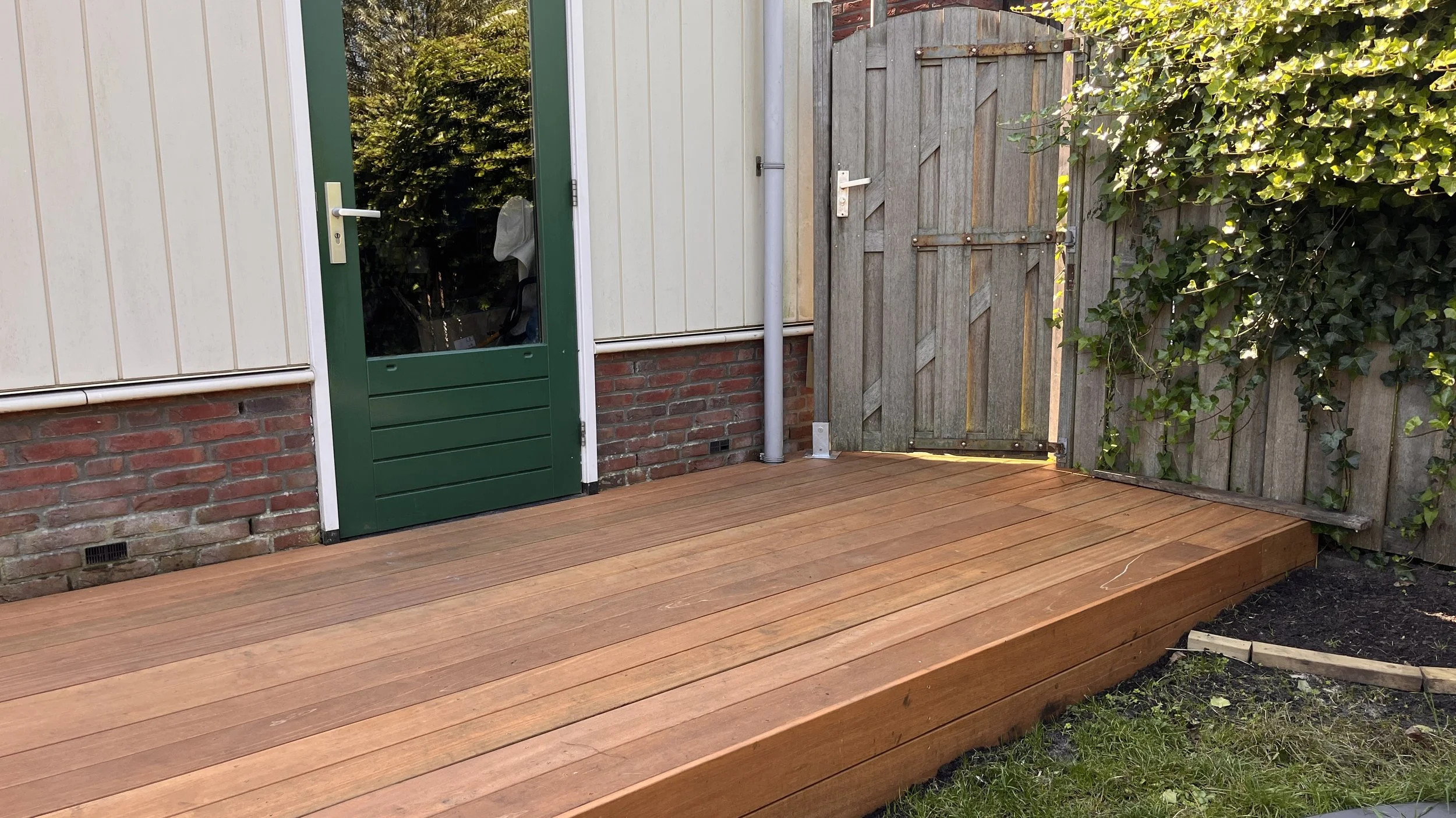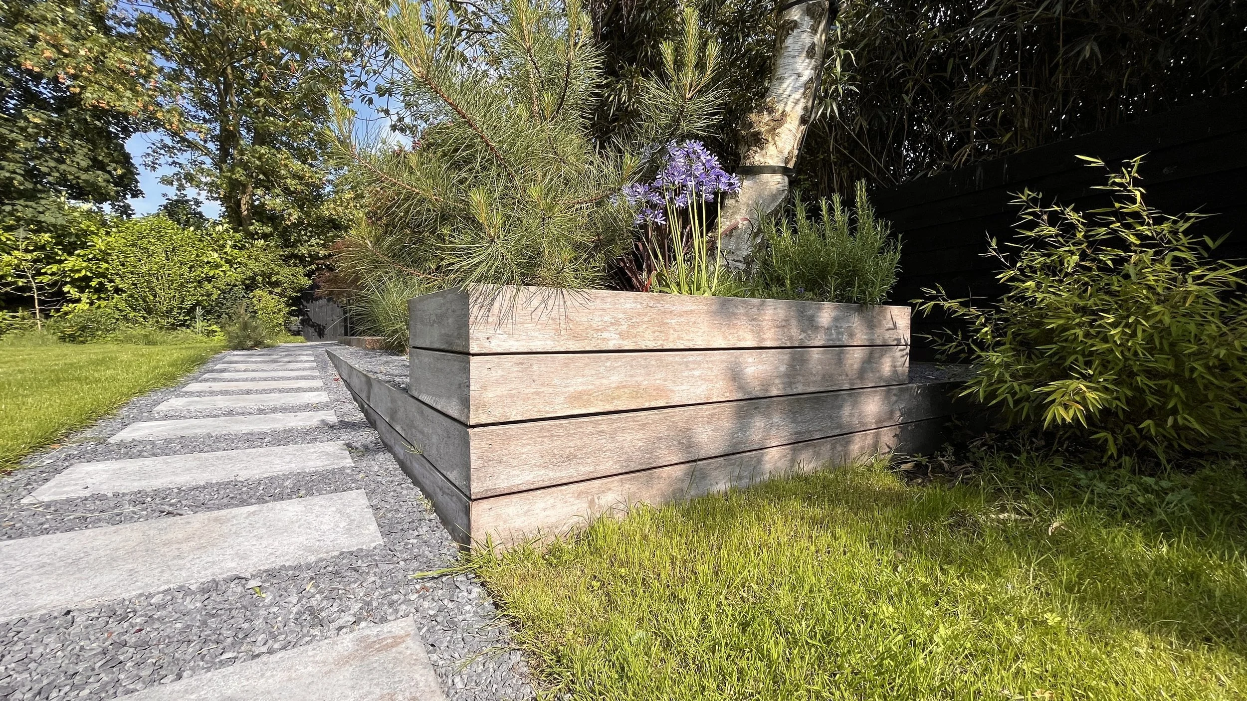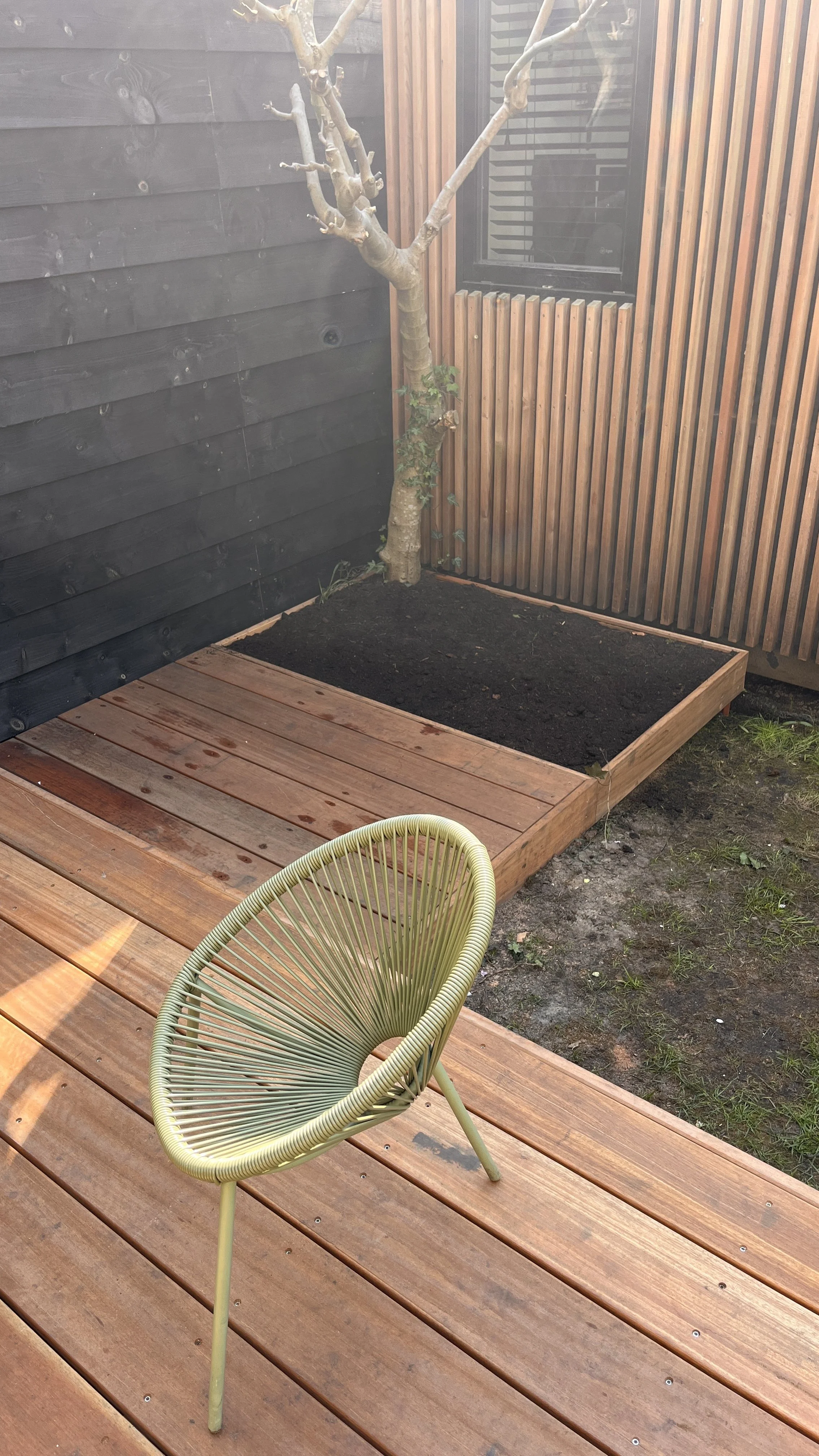 Deze stadstuin kreeg een make-over in drie lagen. De wens: meer leefruimte, sfeer en een slimme indeling. Resultaat: een hardhouten vlonderterras op drie niveaus, elk met een eigen functie. Boven het balkon, omringd door maatwerk plantenbakken voor groen en veiligheid. Een trap leidt naar het middenniveau: een 'floating deck' voor een zithoek. Het laagste niveau heeft een robuust platform voor de barbecue, met een geïntegreerde plantenbak als omlijsting.