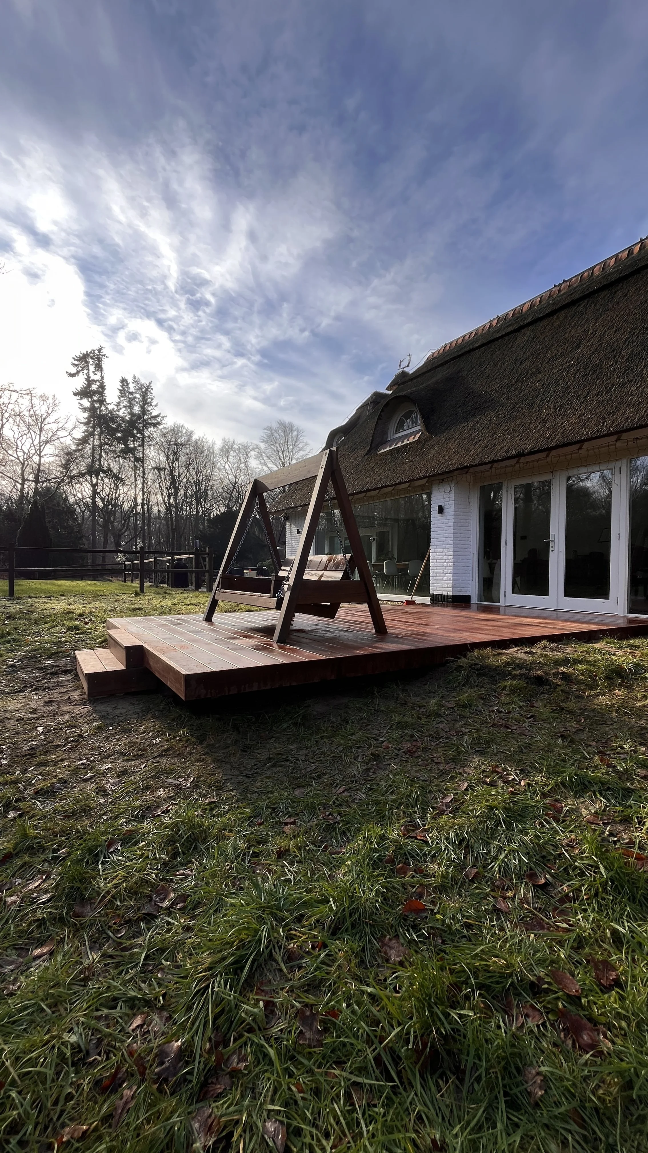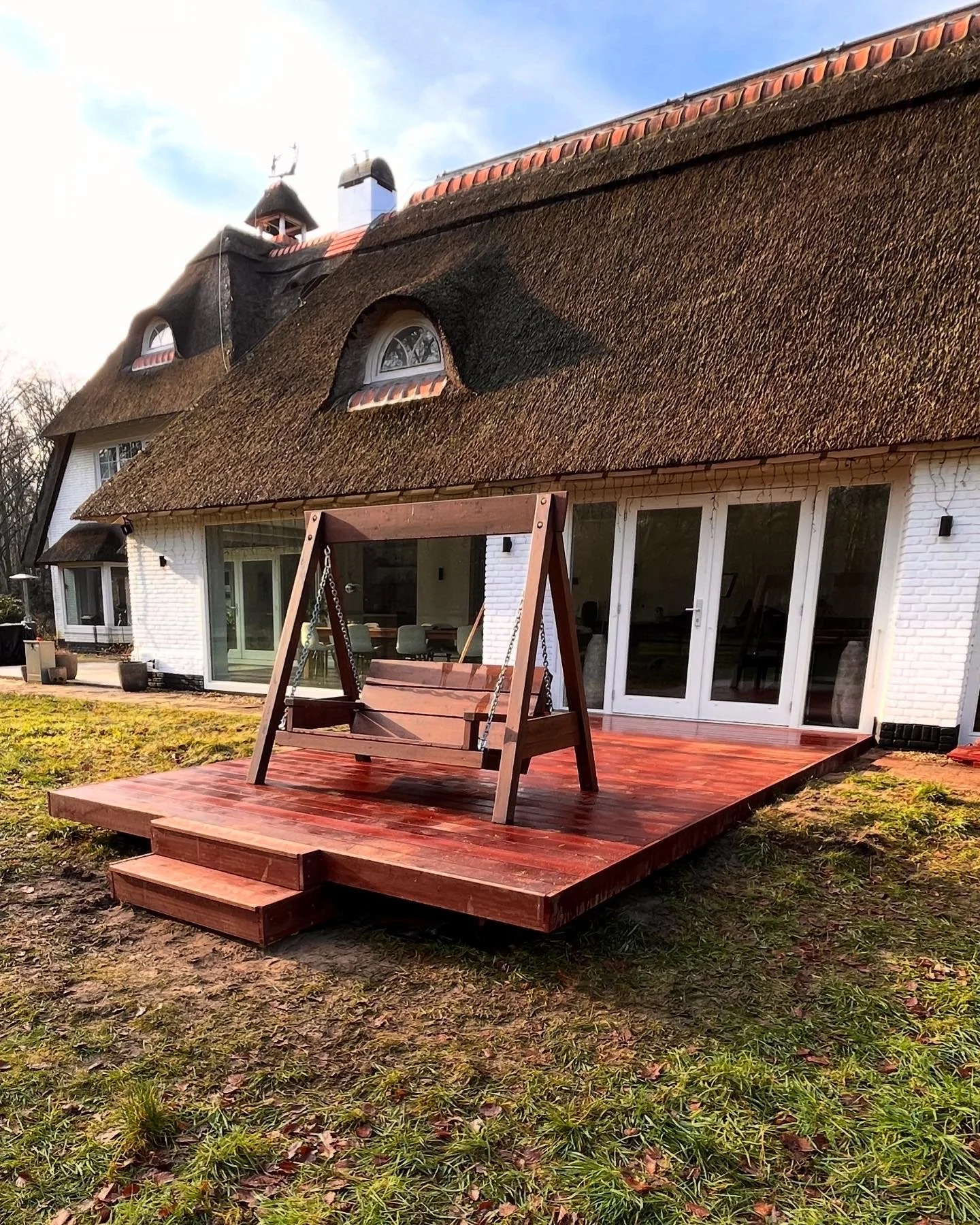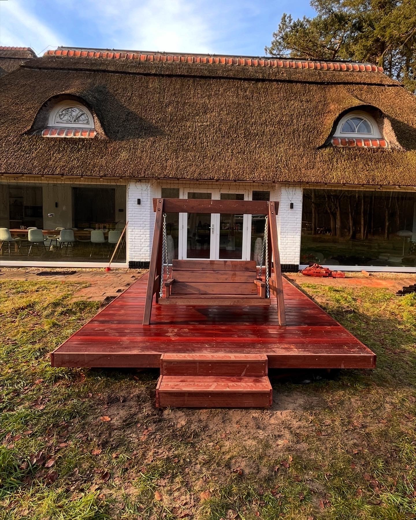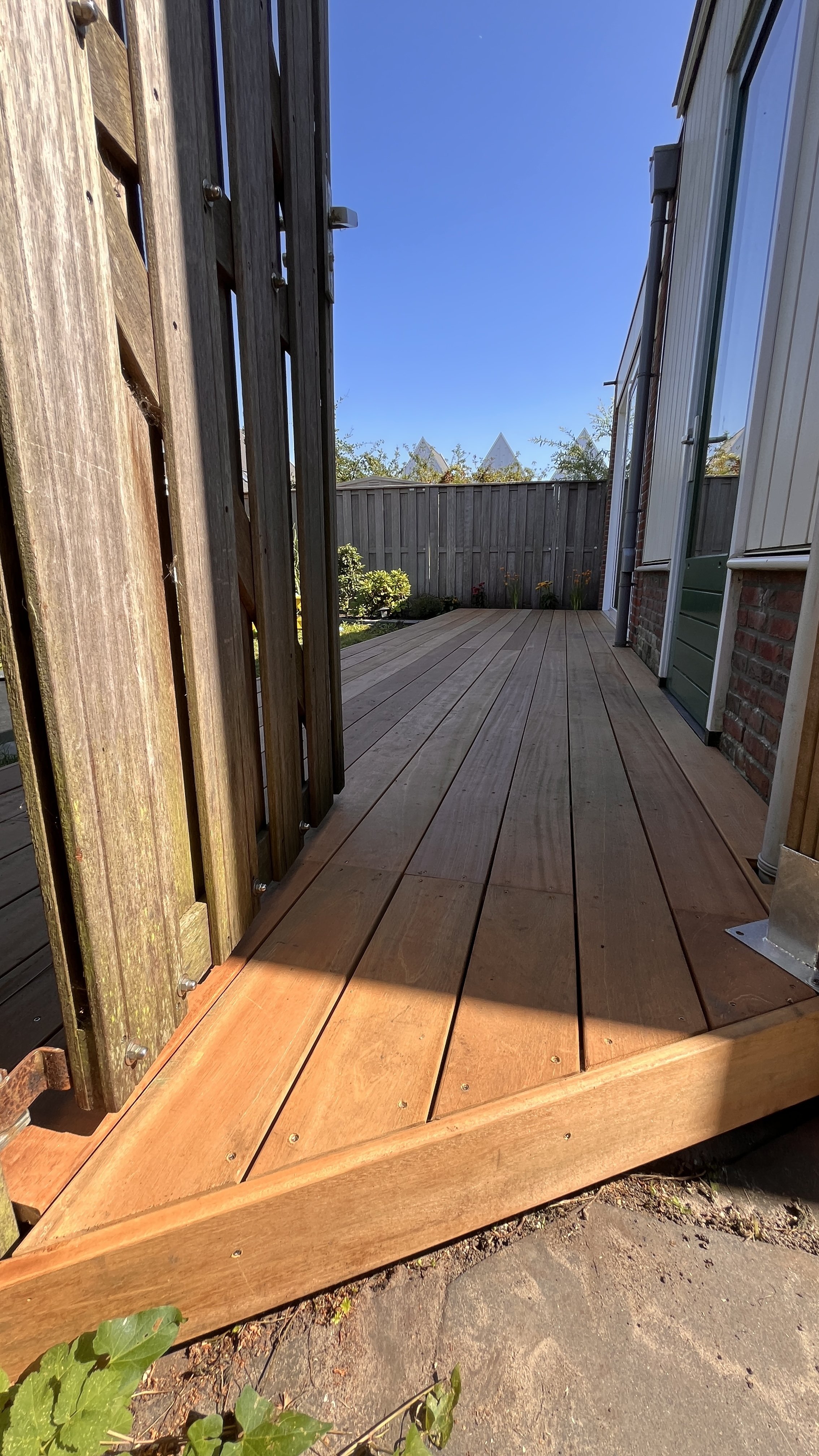Meeder Maatwerk heeft het vlonderterras ontworpen met een focus op duurzaamheid en esthetiek. Het gebruik van Massaranduba hardhout zorgt niet alleen voor een lange levensduur, maar biedt ook een natuurlijke schoonheid die de buitenruimte letterlijk en figuurlijk oplicht. De op maat gemaakte trap vormt een functionele en visuele verbinding met de tuin, waardoor de overgang tussen de woning en de buitenomgeving soepel verloopt.