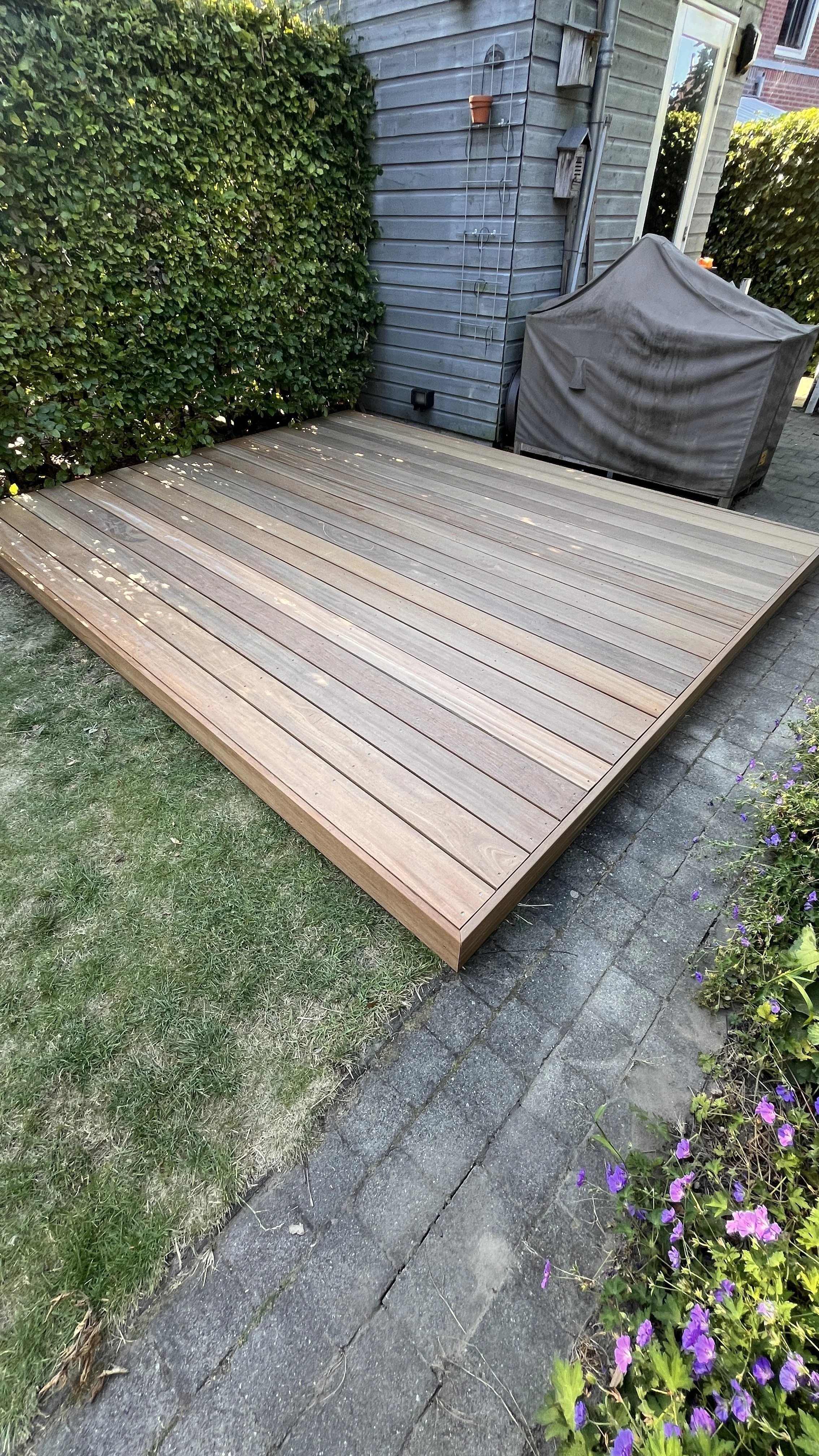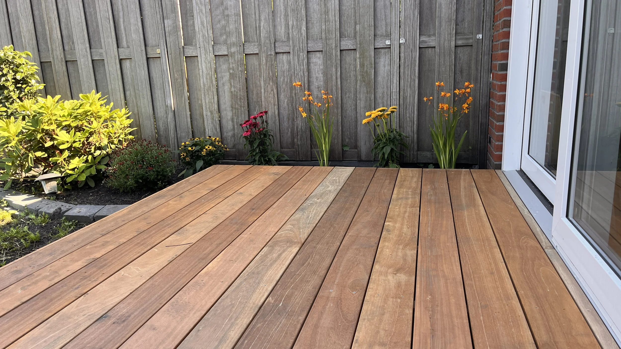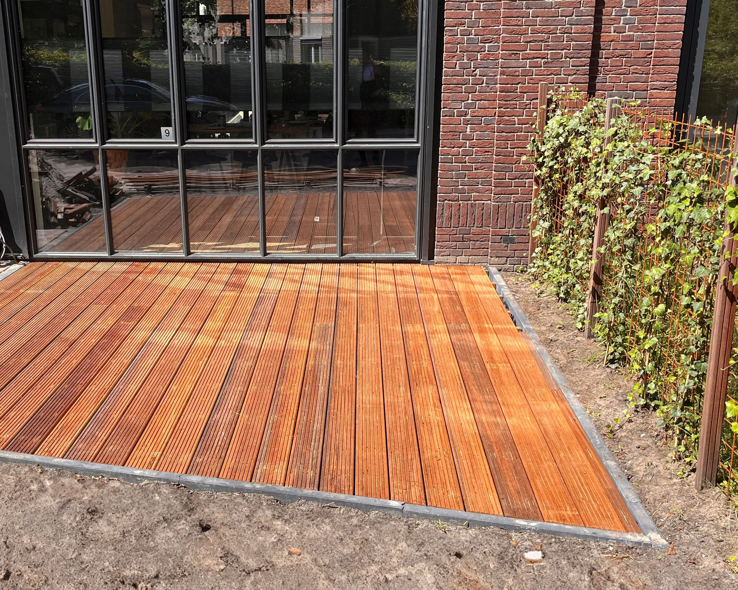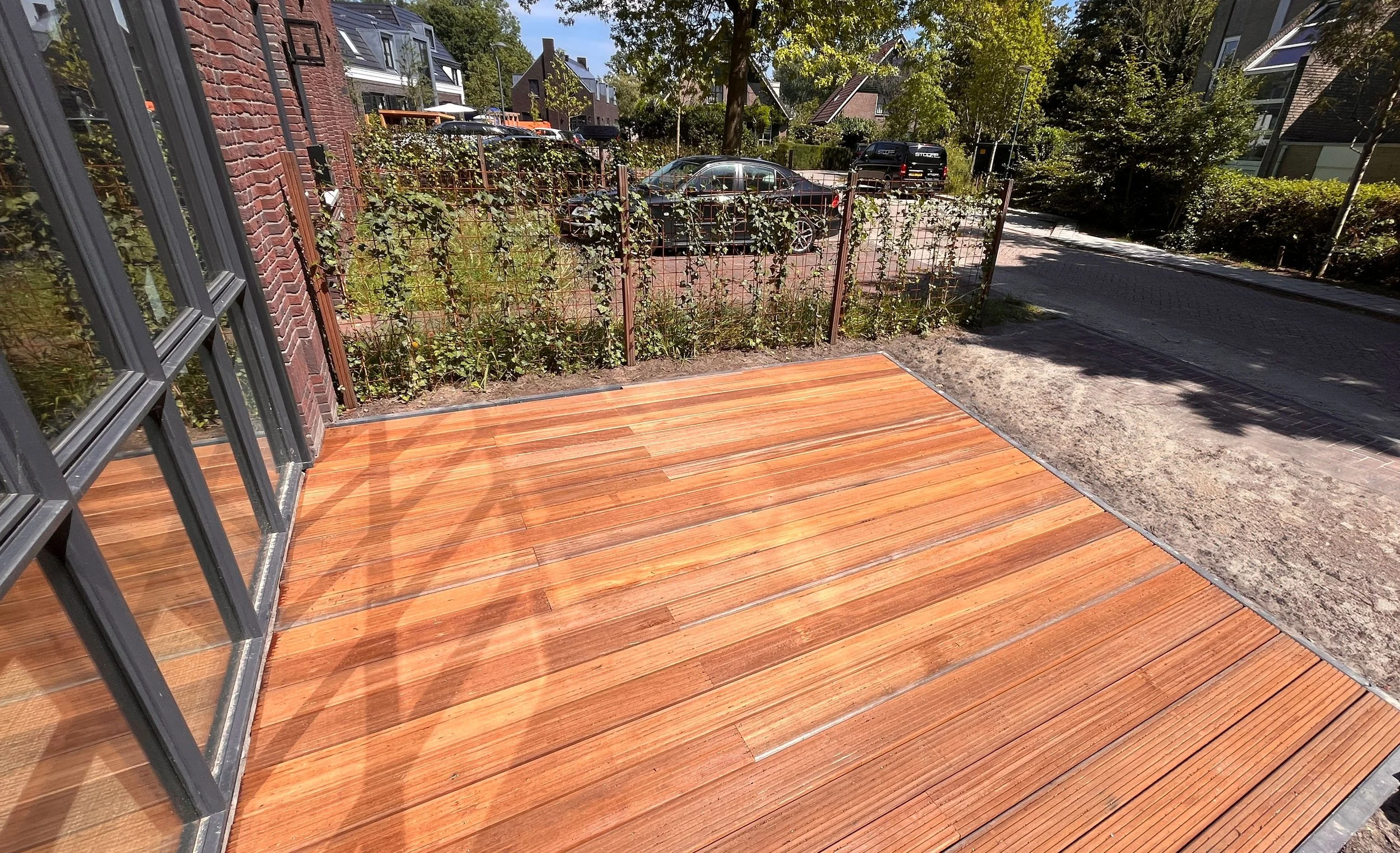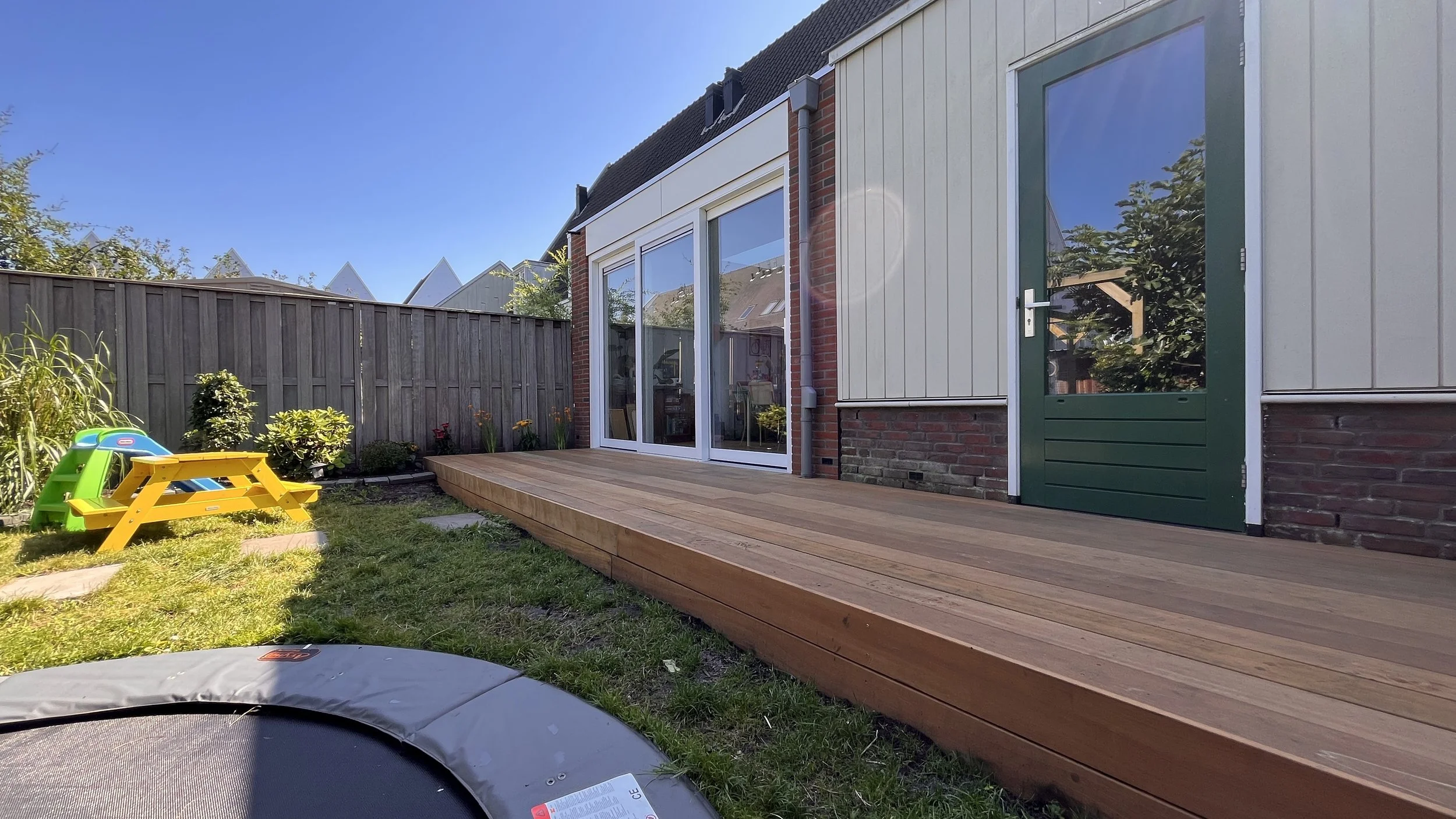 Meeder Maatwerk heeft het vlonderterras ontworpen met een focus op duurzaamheid en esthetiek. Het gebruik van Massaranduba hardhout zorgt niet alleen voor een lange levensduur, maar biedt ook een natuurlijke schoonheid die de buitenruimte letterlijk en figuurlijk oplicht. De op maat gemaakte trap vormt een functionele en visuele verbinding met de tuin, waardoor de overgang tussen de woning en de buitenomgeving soepel verloopt.