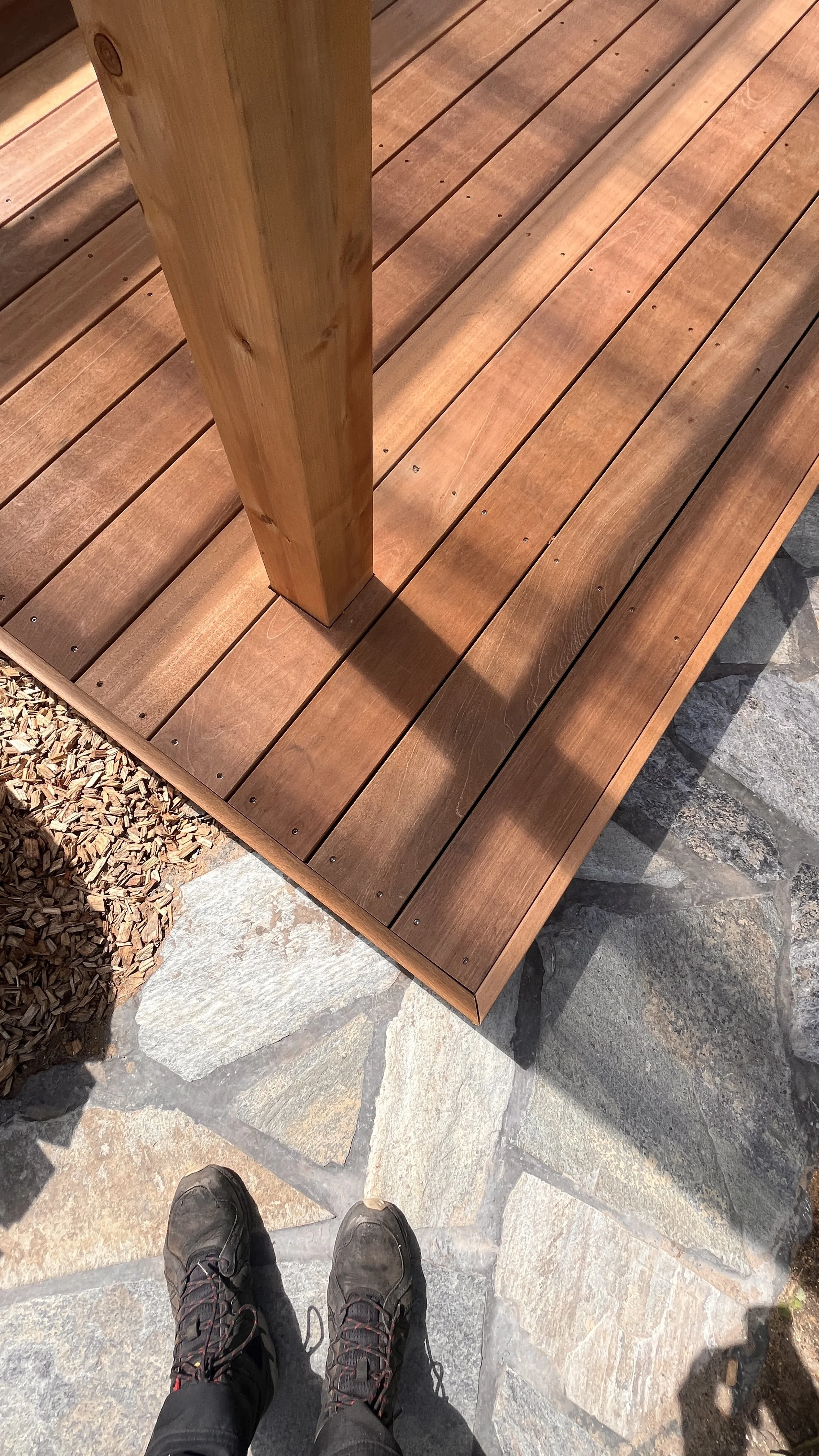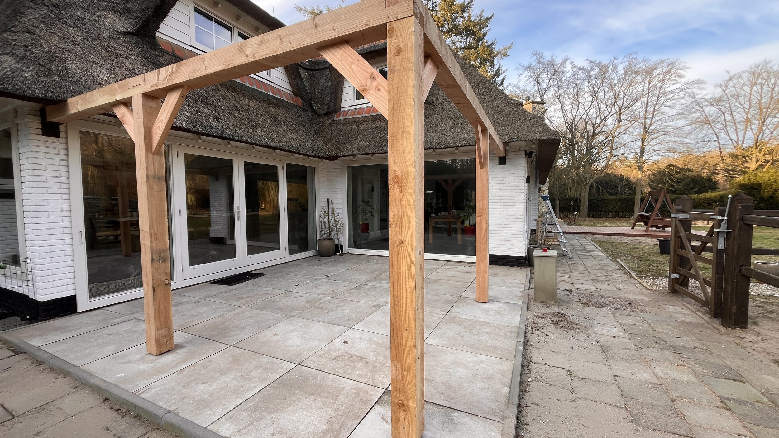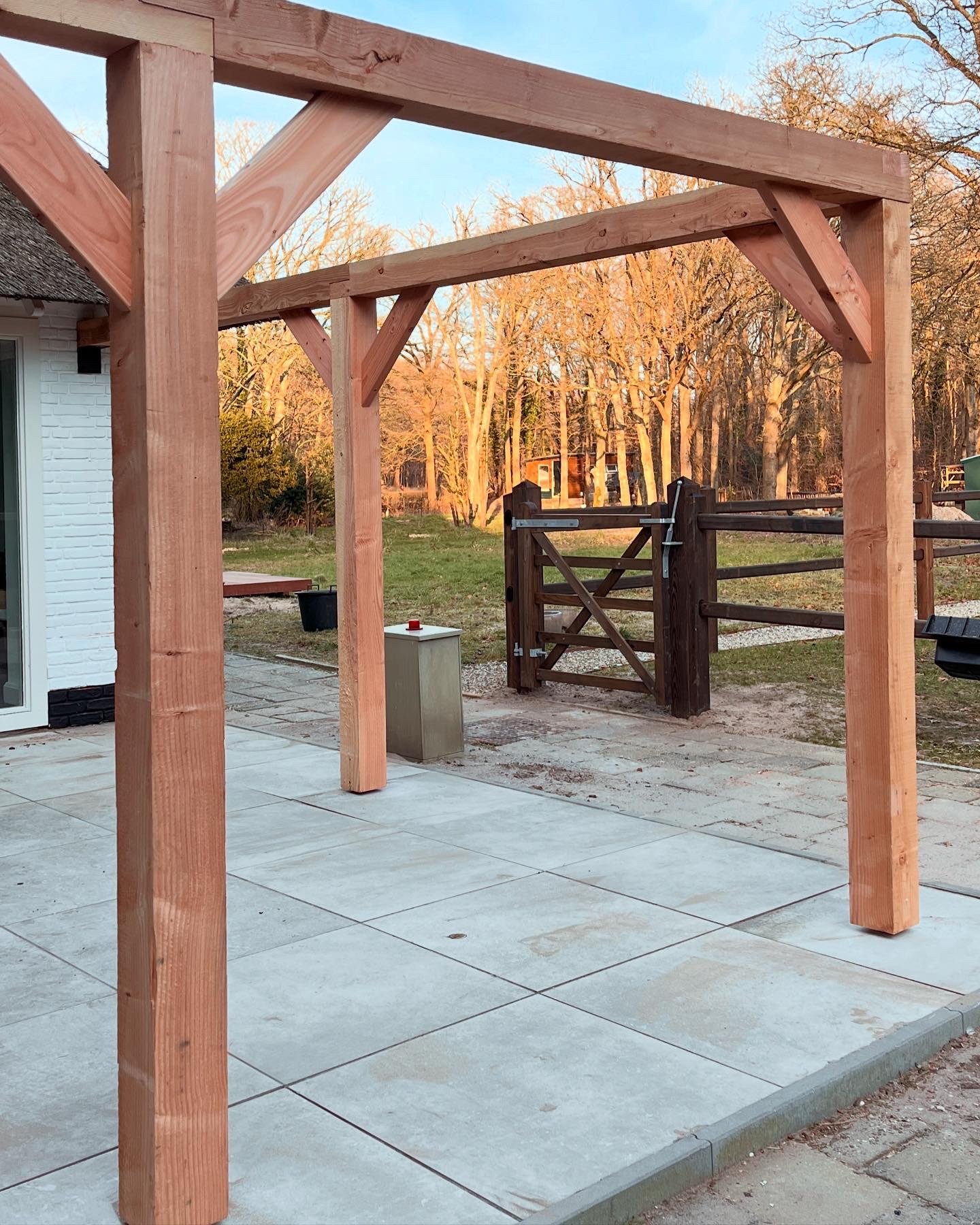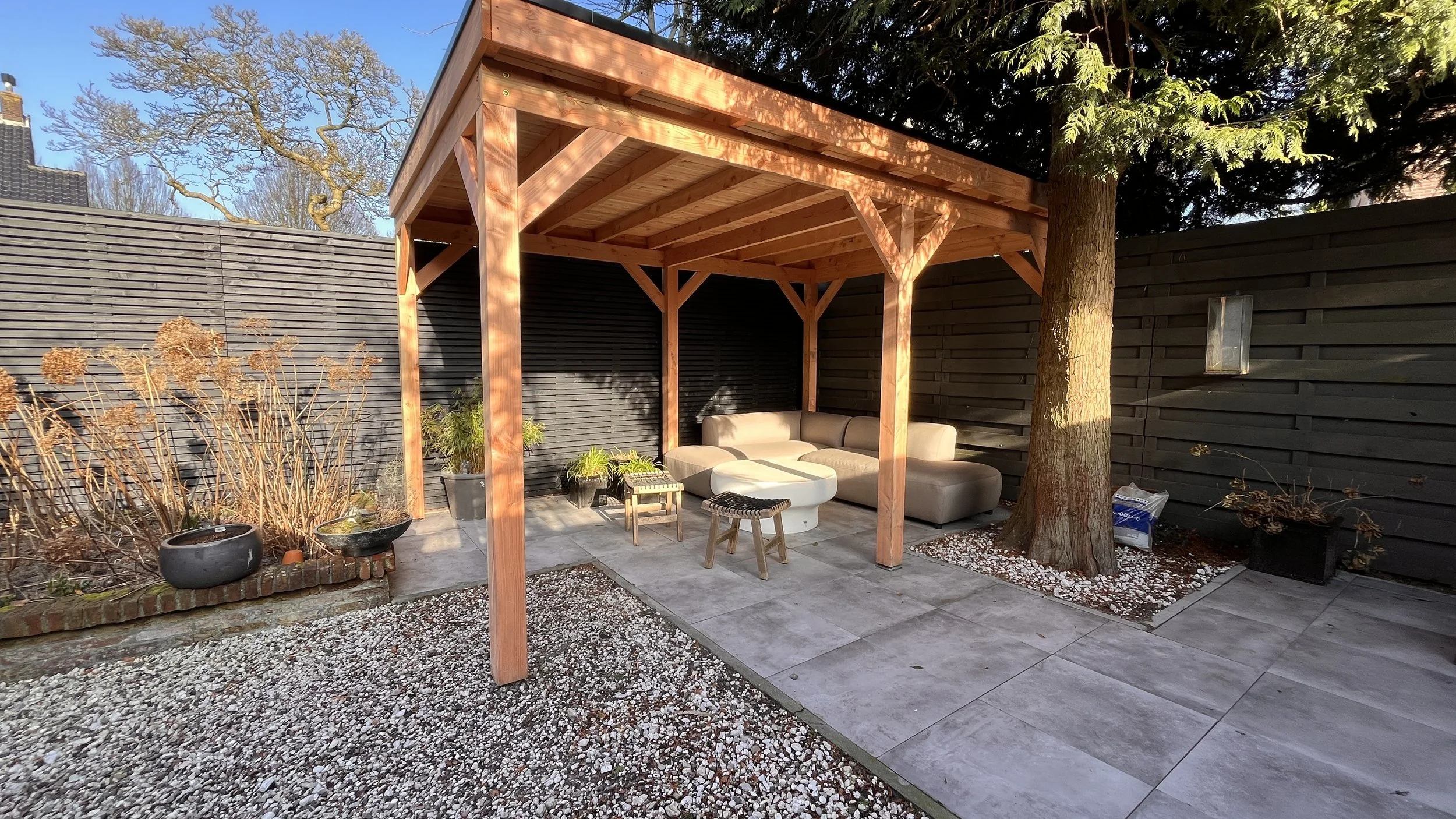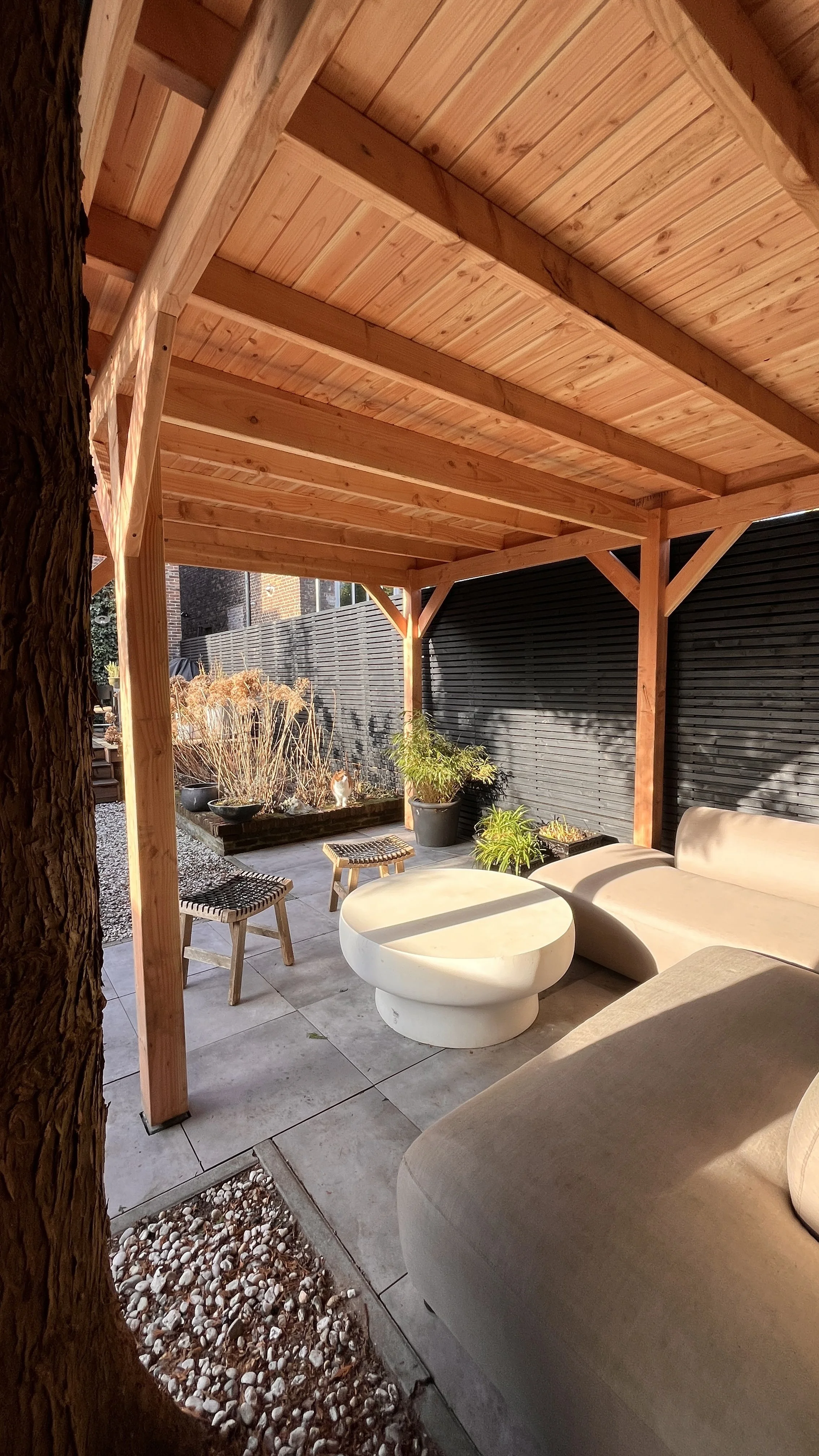 Deze maatwerk overkapping van Douglas hout is meer dan alleen praktisch. Het warme, natuurlijke hout creëert een fijne plek waar je het hele jaar door kunt ontspannen en samen kunt komen. Regen of zonneschijn, hier ben je altijd beschut en verbonden met buiten. Daarnaast is er een zwarte chique schutting bij gemaakt, die niet alleen privacy biedt, maar ook een stijlvolle uitstraling aan je buitenruimte geeft.